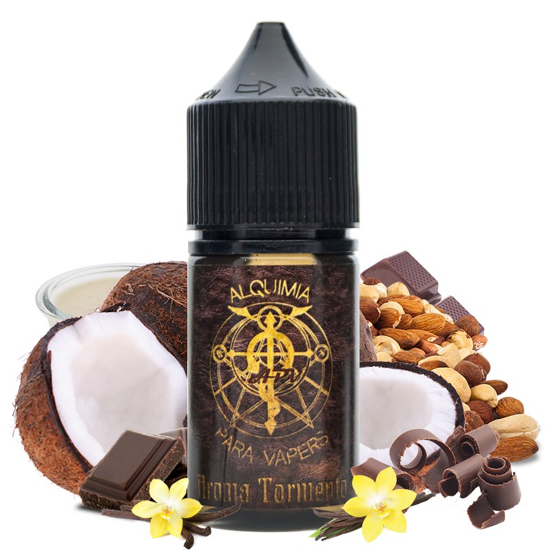 El Aroma Tormento APV 30ml 0mg de Alquimia para Vapers ofrece un perfil dulce y complejo que combina vainilla, chocolate, crema de leche, coco y frutos secos.